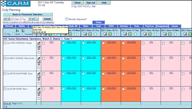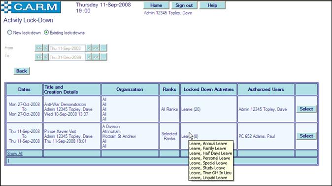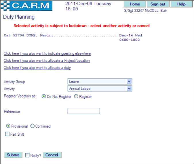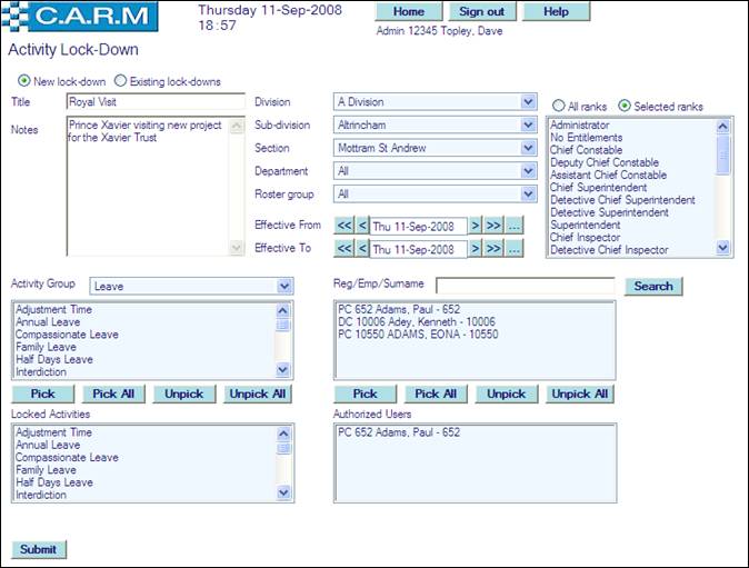 Periodically, it will be necessary to lock the Duty Plan so that certain activities cannot be booked. For example, there is a Royal Visit or Project/Locations, which will be policed by a sub‑division of an OCU. As a result there is a need to prevent leave or Lieu time off being booked, except by authorized personnel.