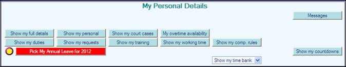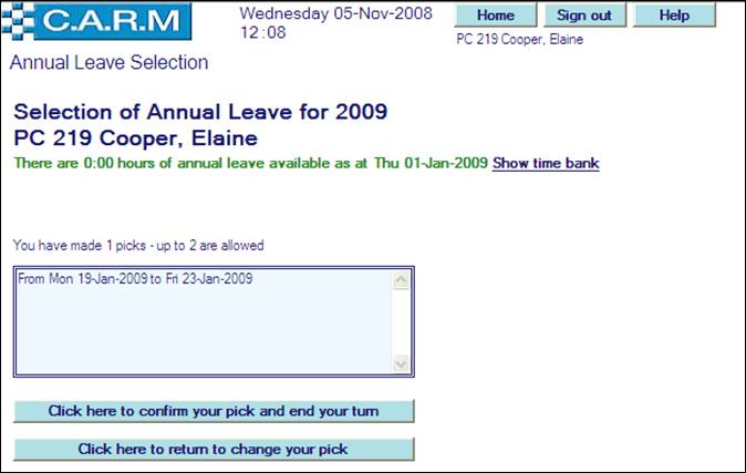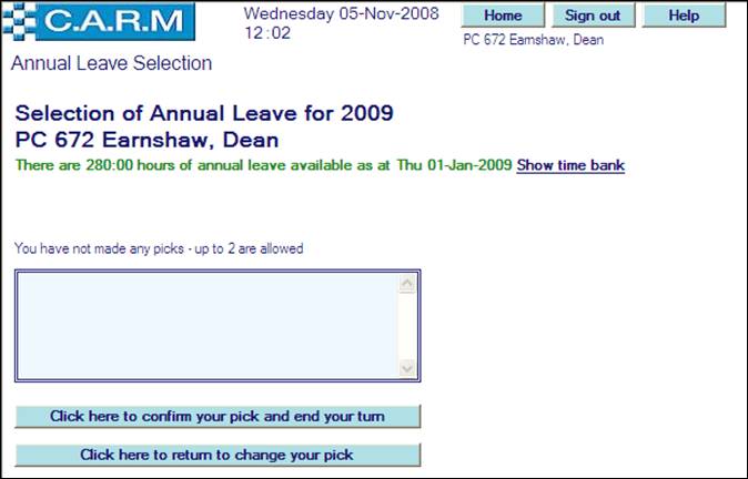 To initiate the picking facility, the CARM System Administrator will set a system parameter to the next year to be picked (see System Maintenance > System Control Parameters). Once that is done, the most senior person in each group of personnel will then be invited to pick their annual leave blocks. When that person signs in to CARM, a large red button (with, optionally, a flashing light) in the 'My Personal details' section of the Home Page will indicate that the pick facility is ready.
