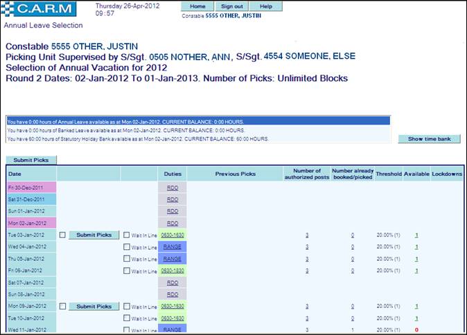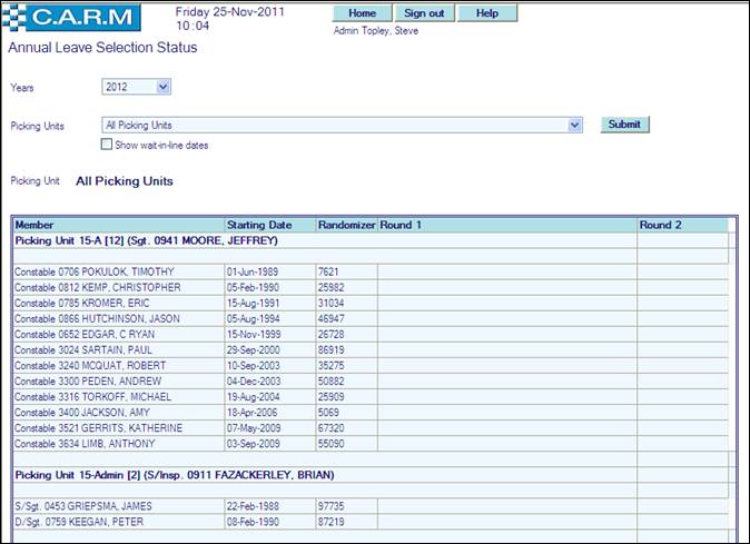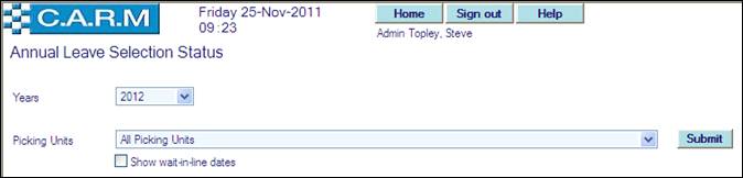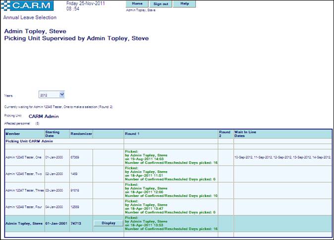 CARM has a facility whereby, annually, individuals may pick blocks of annual leave for the following year. The pick is organized so that the most senior person in a group of personnel has first choice followed by the next most senior, etc. There is a limit as to how many people can take annual leave at the same time to avoid leaving shortages of cover. There is also a limit to how many blocks of annual leave may be picked. A block of annual leave is a number of consecutive working days. For example, someone who works five days a week will pick blocks of those 5 days. Someone who works 4 days a week (perhaps on 12 hour shifts) will pick blocks of those 4 days.