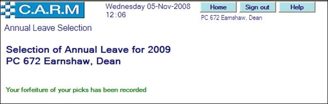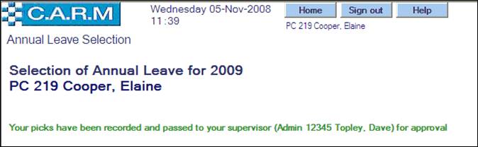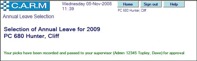 · Select Duties > Annual Leave Selection Status which will display the following page: