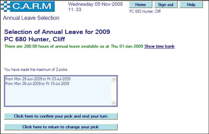 Amount of annual leave in your time bank at the start of the pick year is displayed at the top of the page.