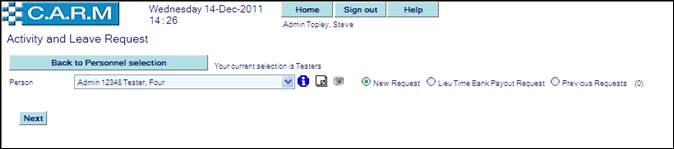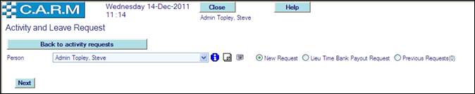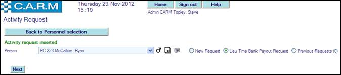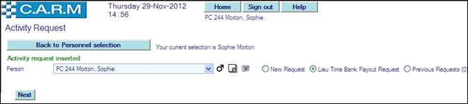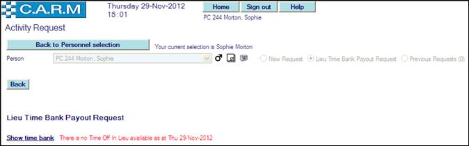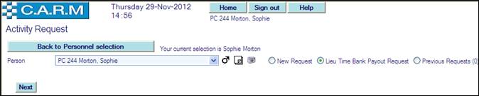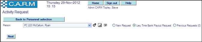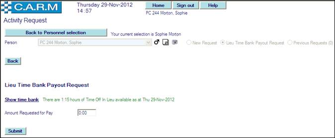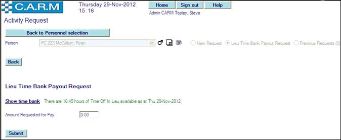 Select time from the Extra Pay (lieu time) bank for payment. Uses 'Activity and Leave Request/Authorization' process with an additional option to request and authorize payout requests. (See Activity Request Authorisation for authorising details).