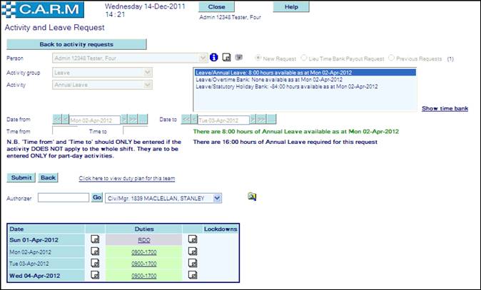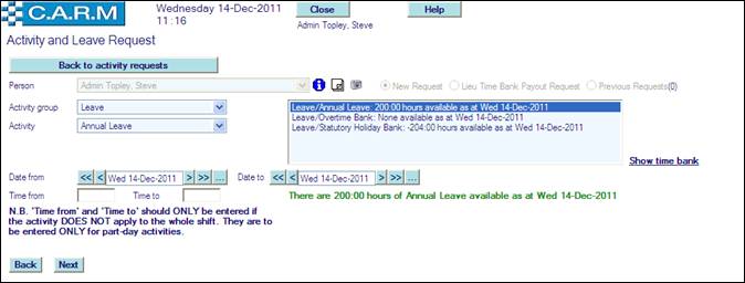 · Select any Time from and Time to of those dates required (e.g. if a half a days Annual Leave is requested, enter the times of the shift to be taken off).