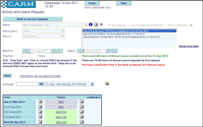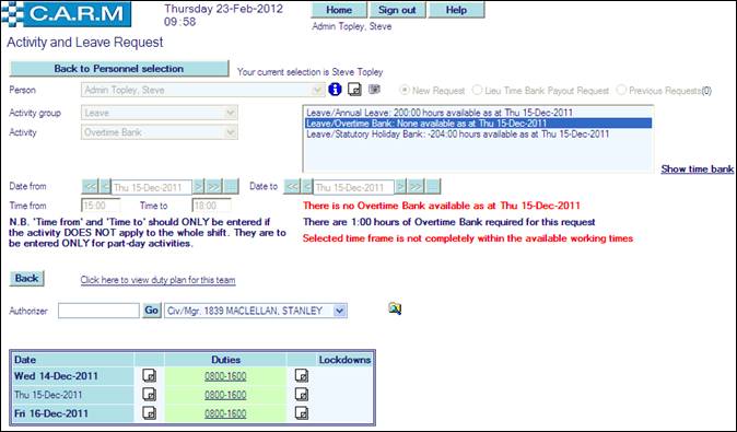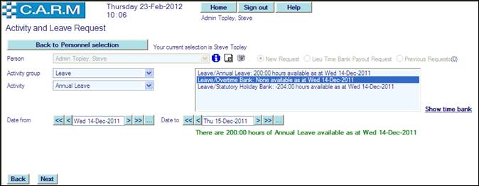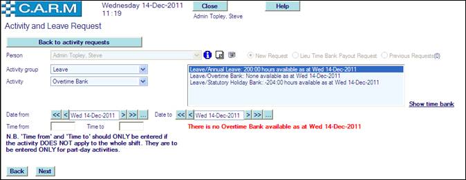 The system may be configured to disallow any request for time from a time bank that would result in that bank going negative. If it is, a page like the above example will be shown and that request for time off cannot proceed. The amount of time off requested is shown underneath the balance of the time bank for that activity with an error message indicating insufficient time in the bank. It is necessary to click on Back to return to the previous page and select a different activity.