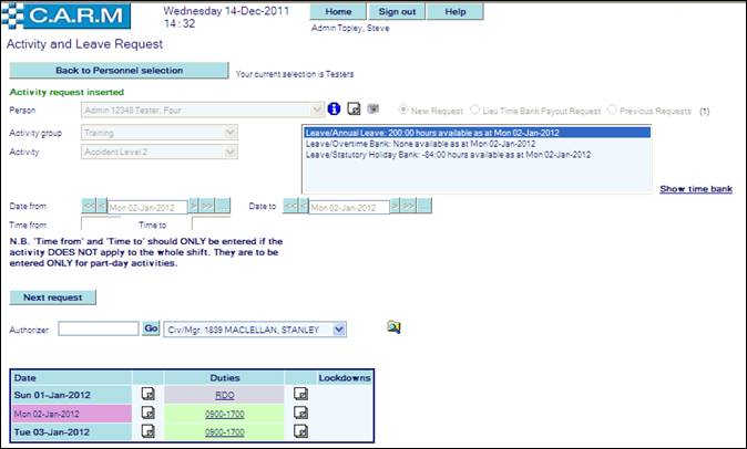 How to make requests for Leave; although any activity can be requested e.g. a person may request some Lieu time off for themselves but equally, HR may request a number of people to attend a seminar. We have shown these 2 items separately because the selections for each will be slightly different. However, in each case, the process follows the same 3 distinct actions: