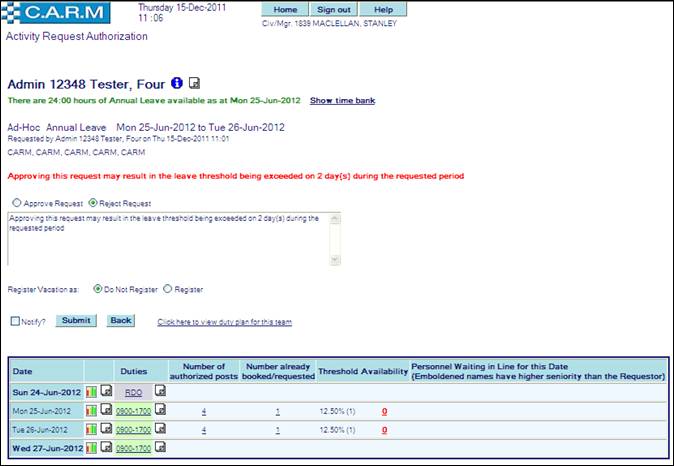The designated authorizer picks up the request and actions it. The authorizer may authorize or reject the request.