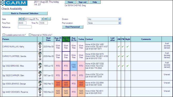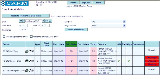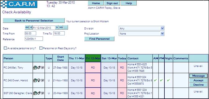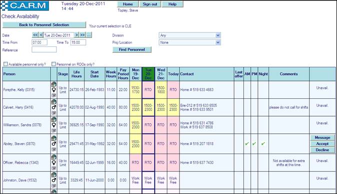 Individual personnel can mark non-working days as available or not available for work for specific time periods. (See Show my availability for full details). Enables a check on who is available at any time during a specific time period. This facility enables Line Managers to contact available persons in order sorted by criteria dictated by the organisations policies and agreements.