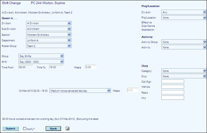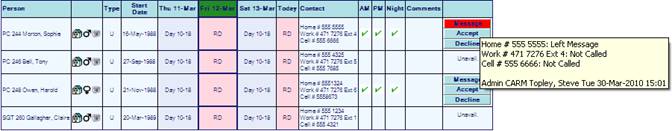 Enables line managers to contact the top person in the availability list and offer the time period required to be filled. If they accept, apply the time period to them from this screen. Updates Duty Plan and Backfill Availability.