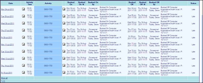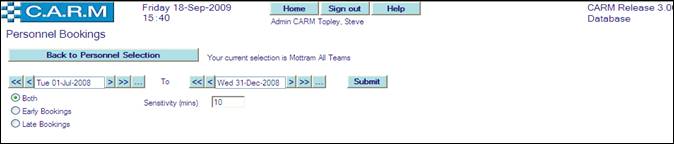 Enquiry shows details of those personnel who book in/out early or late for a specified time range.