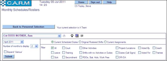 Show all the duties in a calendar format starting from the selected month for a selected person.
