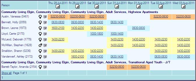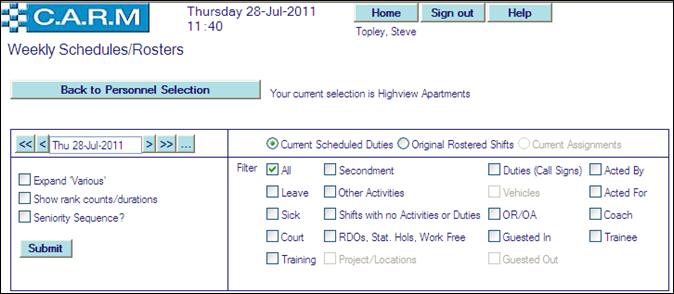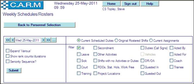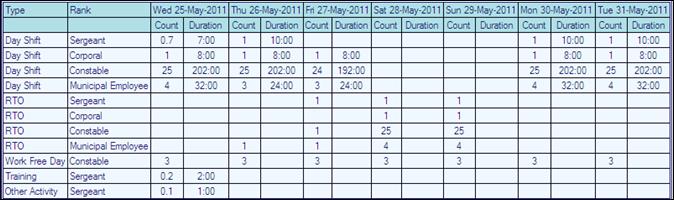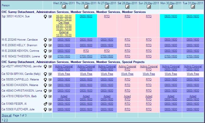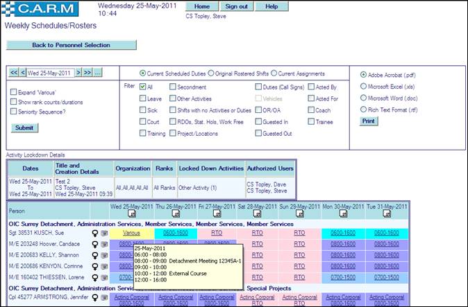 · Hover cursor over shift details shows all details for that shift including a Reference such as 12345A-1 on Various for Sgt. KUSCH, Sue on Wed 25-May-2011 (up to 10 characters recorded against tours/activities displayed in various Enquiries and reports).
