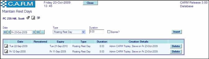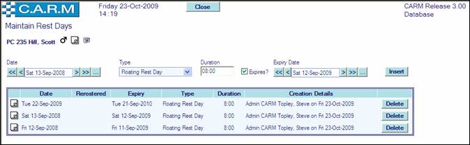 · Click Delete against the relevant day to manually remove a manually cancelled rest day.