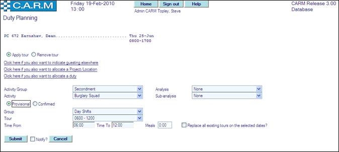 Changes of Shift, Activity, Duty, Assignment or Operation can be notified via email or CARM internal messaging.