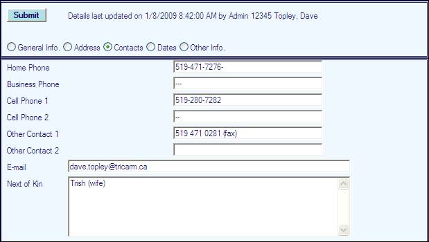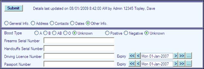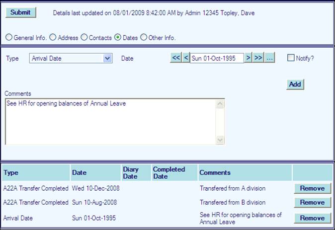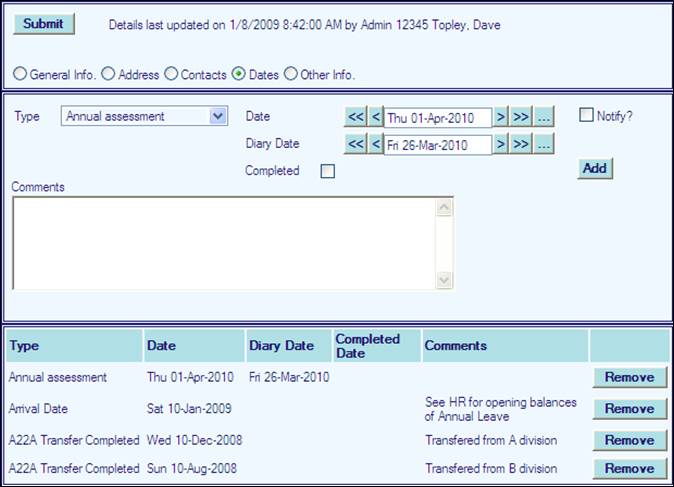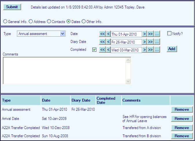 · Ability to record a diary date and a completion date against selected date types. Date types are controlled by lookup table entries which are set by System Administrators. (See Look Up Tables for details of Personnel Dates table).
