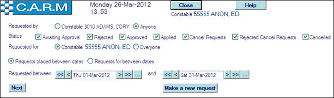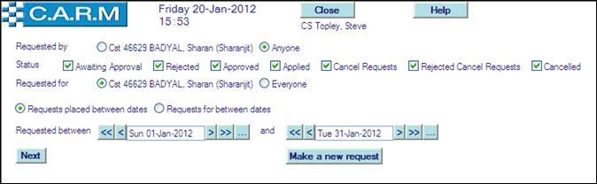 · Select Status of requests to view by clicking to place or remove the tick in appropriate box.