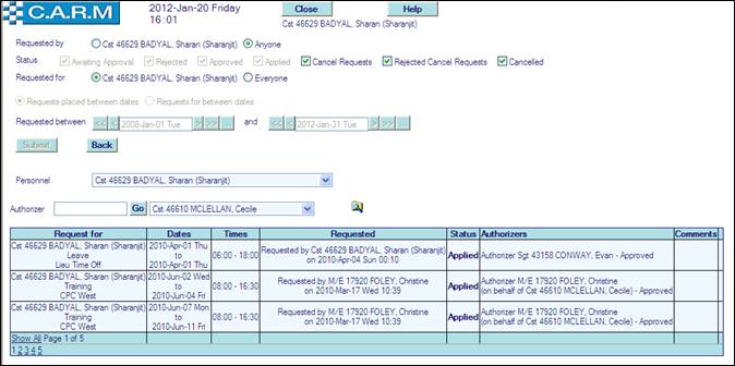 Select a person whose requests you want to see from the resulting drop down list of personnel satisfying the search criteria.
