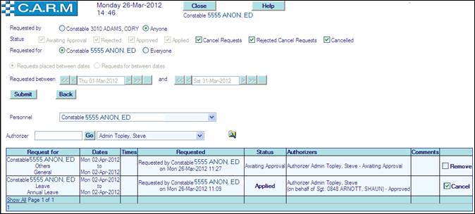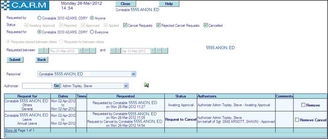 All requests satisfying the selection criteria will be listed giving information about status of each request. If a request is still awaiting approval it may be removed by selecting the Remove option and clicking Submit.