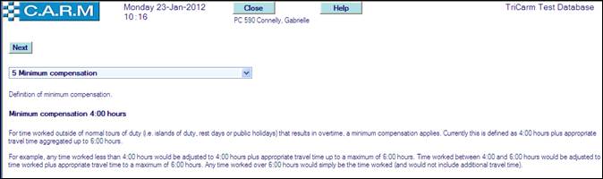 The Compensation Rules Drop Down shows the rule name and describes the compensation a person receives for the selected type of Extra Pay, including cancelled rest days and additional tours of duty.