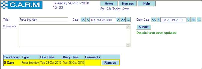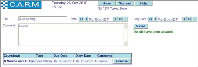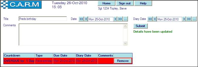 · Click Show my countdowns in My Personal Details section of Home Page (Button will be Red with Optional Flashing light if a Date is Due or Overdue on today’s Date).
