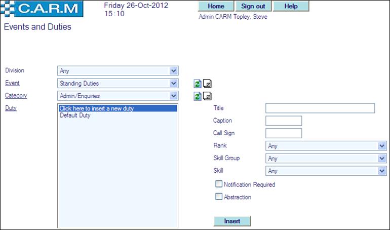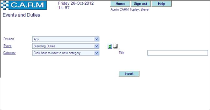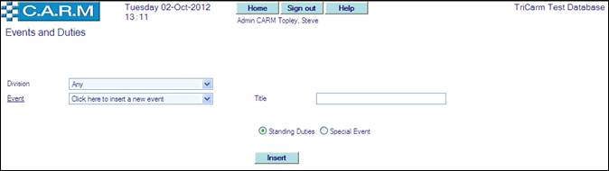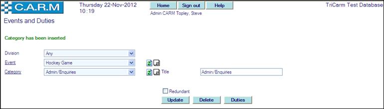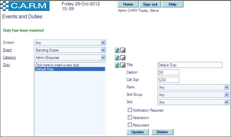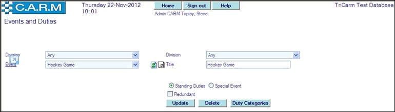 · Where required click Delete to delete this event and all of its duty categories, duties, Event plans and duty plans together with all related notes, PROVIDED there are no duty allocations for this event.