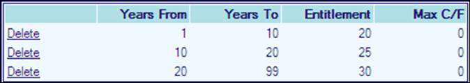 The start of the next band MUST equal the end of the previous band e.g. 0-2, 2-5, 5-10 etc or the entitlements will not be correctly calculated, and NOT 0‑2, 3-5, 6-10. |