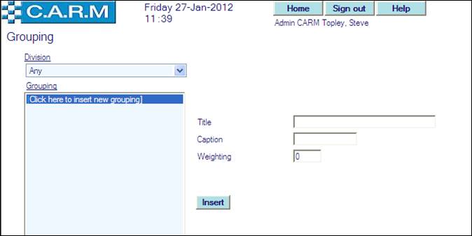 · Where the Grouping belongs to a specific division only, select that from the drop down list. This assists with sorting/selection later. If the grouping applies throughout the organization, leave this at Any.