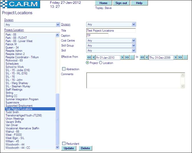 · Select the Project/Location requiring to be made Redundant.