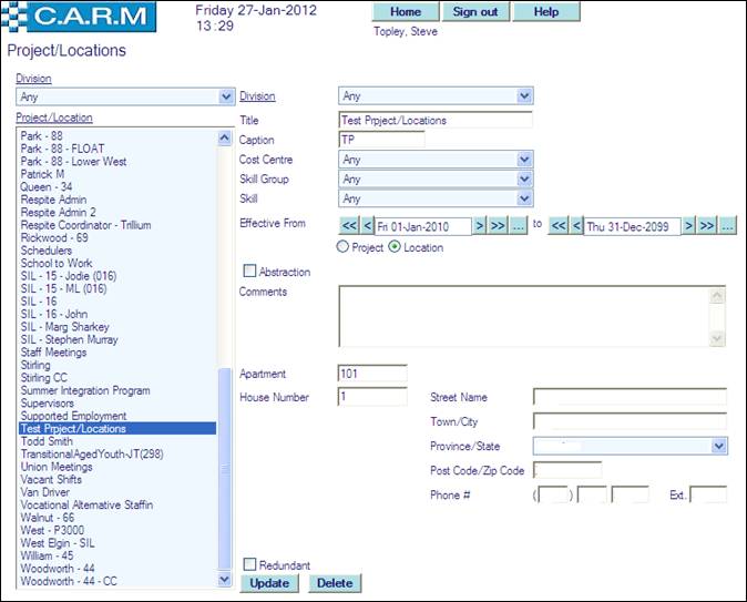 · Select the Project/Location requiring Update.