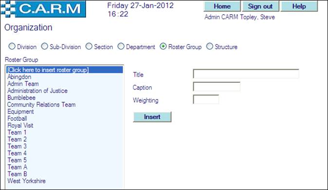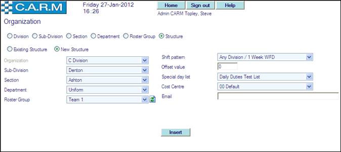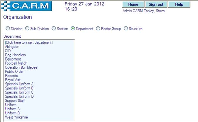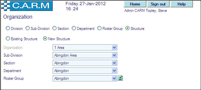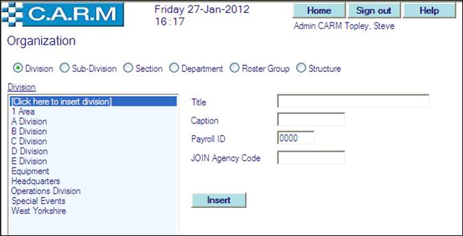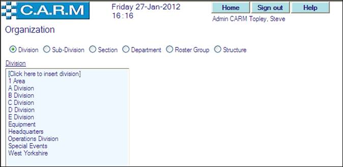 Before creating an Organization Structure, the individual elements (Division, Sub-Division, Section, Department and Roster Group) must be created.