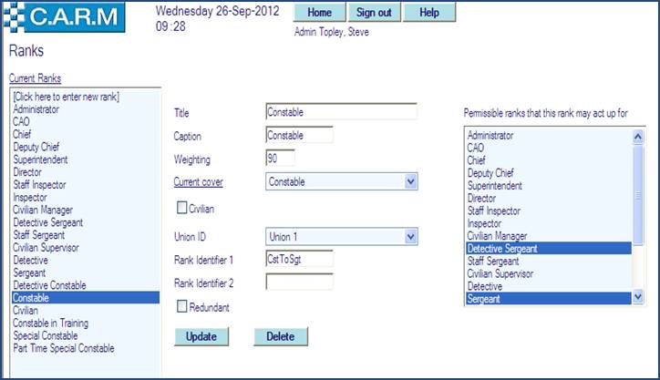 Persons rank including police officers and police staff. Also allows linking like-ranks together for the purposes of resource cover e.g. Sergeants and Acting/Temporary Sergeants can all be included in the cover count for Sergeants.