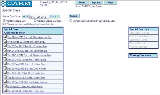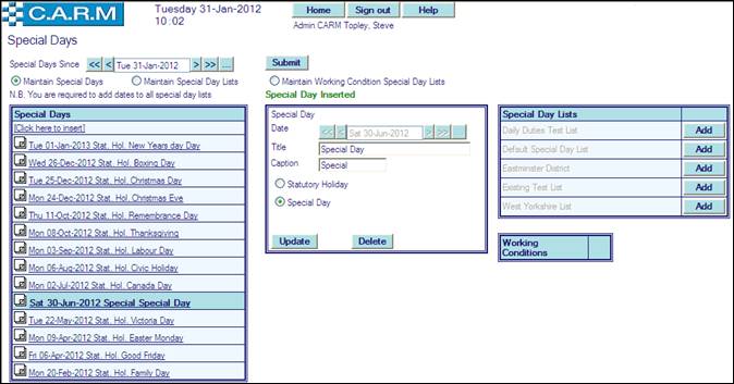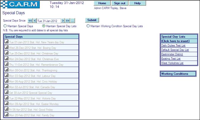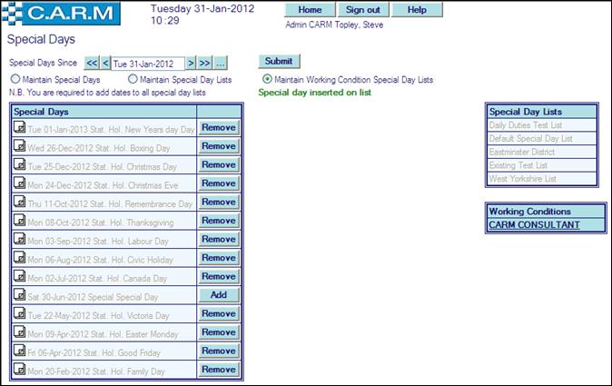 The list is added to and maintained using the standard Special Days Maintenance routine to enable such days to be added / removed from the appropriate Working Conditions. (See Applying the Statutory Holiday or Special Day to a Special Day list)