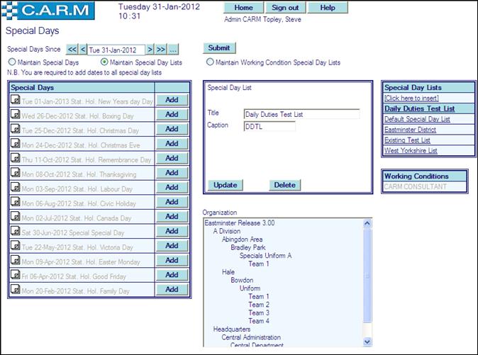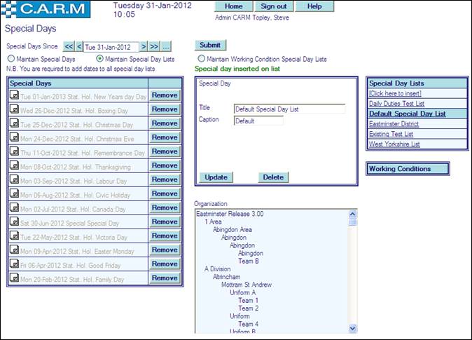 There is no need to create separate lists for Officers and Police Staff. Please contact the CARM Help Desk if you are unsure how to proceed. See also Create Organization Structure for details on how to apply the Special day lists to an organization structure. |