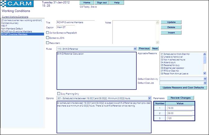 Use Working Conditions Maintenance to create new and update existing Working Conditions, amend title/caption information, enter additional notes, change the selected Rule Options and to vary some of the parameters associated with some rules.