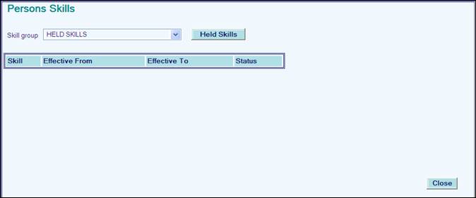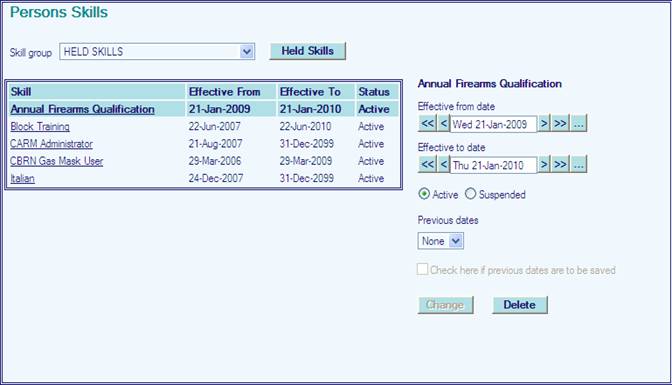 Maintain a list of person skills relevant to CARM, together with their start date and expiry date if applicable. For example, Firearm skills with recertification date, language skills, diving skills, etc. These skills may be searched and enquired upon in several areas of CARM including cover requirements if required.