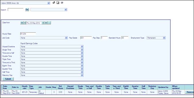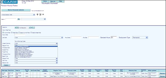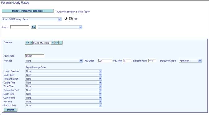 Hourly currency rates for personnel may be manually maintained using this facility. Future facilities will include generation of hourly rates and/or importing of such rates from other systems such as payroll or HR. See details of how to enter Payroll Earning Codes