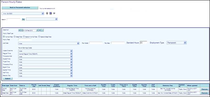 · If there are currently no hourly rates set up for the currently selected person, the page will appear as above. If hourly rates already exist, it will appear as below.