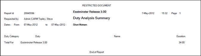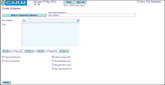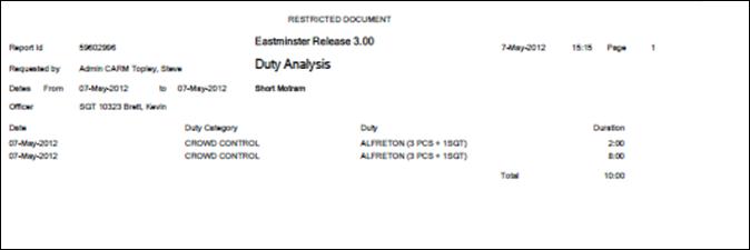 Report analyses all time spent on selected duties by selected personnel within a selected date range.