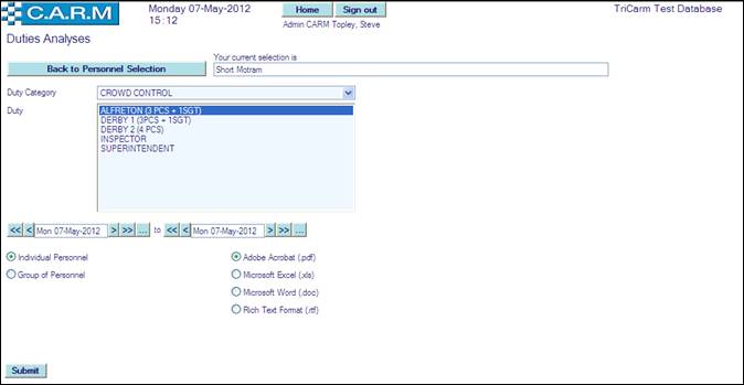 · Select Duty (as many Duties as required for the Report)from the presented list