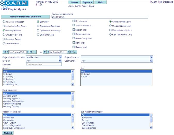 · Select Sub-reason for extra pay if required from the drop down list or leave as Any.