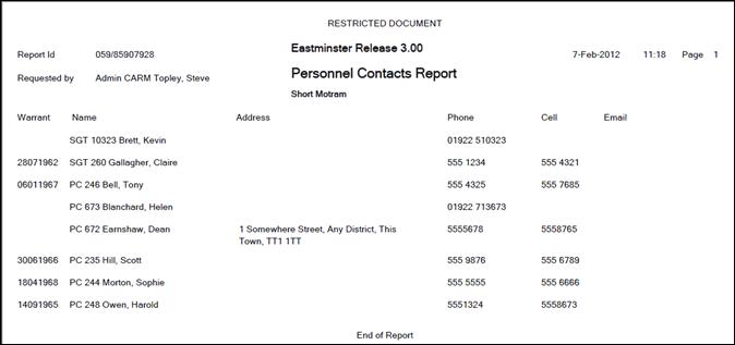 Report produces a list of selected personnel with their addresses, home phone numbers, cell phone numbers and email addresses.
