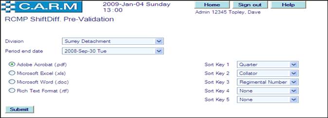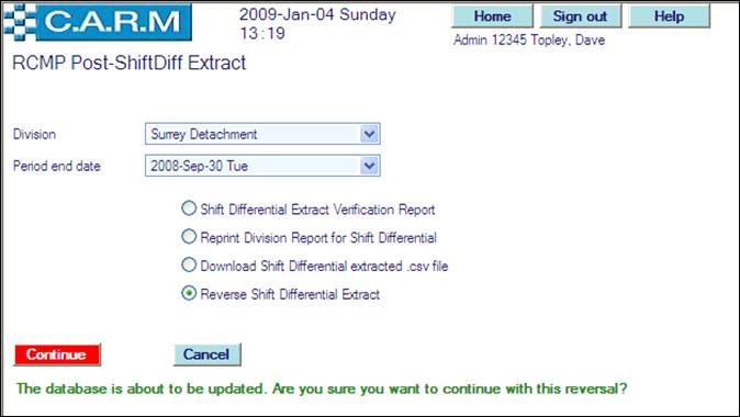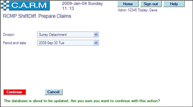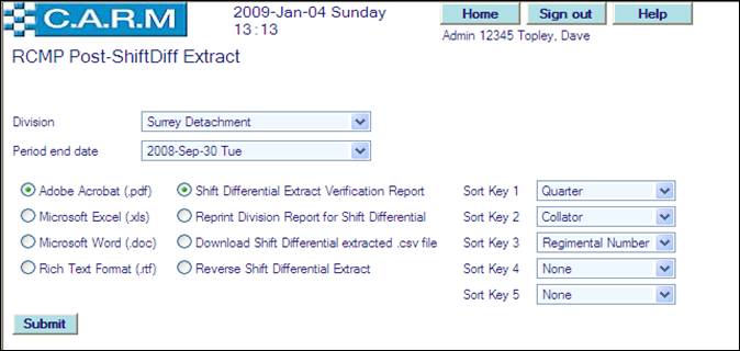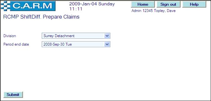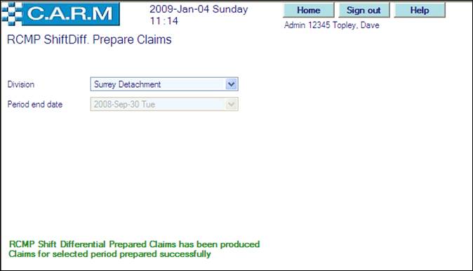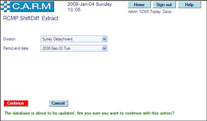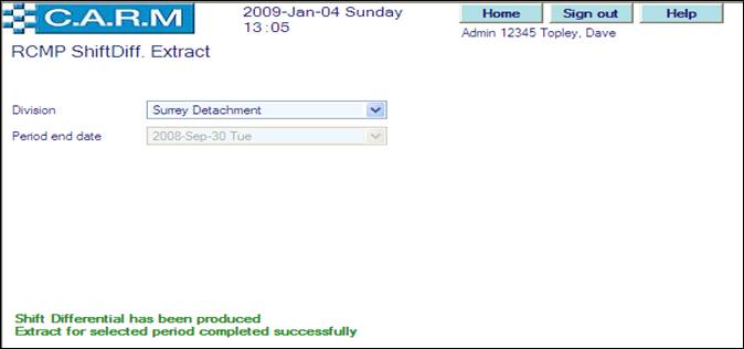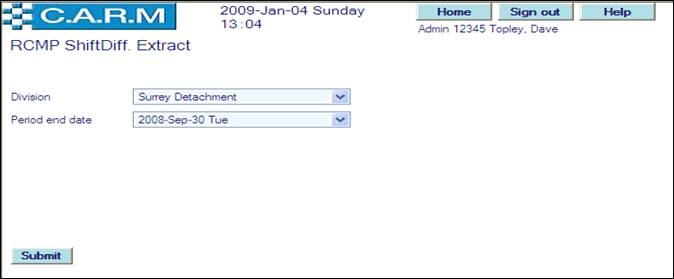 · For the very first run for the selected division, select the Period end date of the first shift differential claims period. Only claims during that period will be reported on. For subsequent runs, the date will be automatically set to three months from the last extraction run for the selected division. All Shift Differential claims will be created for the selected quarter. Such claims then have to be confirmed by each person and authorized by their supervisors using the standard Overtime Claims process.