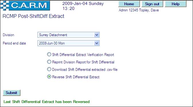 · Select Shift Differential Verification Report (all claims for the selected division that were extracted in the selected period); or Reprint Division Report for Shift Differential (to reprint the Shift Differential report for the selected period; or Download Shift Differential Extracted .csv file (to download the 'comma separated values' file of the extracted claims for the selected period); or Reverse Shift Differential Extract (to undo the last extract in order to possibly make changes and re-extract)