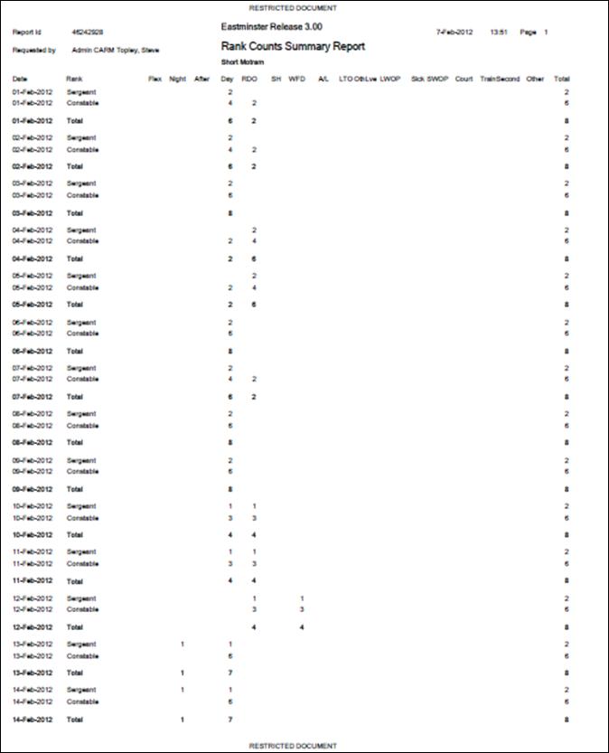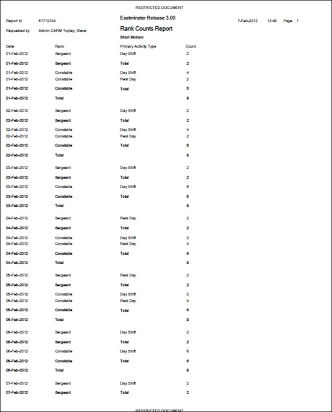 Report produces counts of each primary activity type for each rank for the selected personnel within a selected date range. Only standard shifts are counted - call backs are ignored.