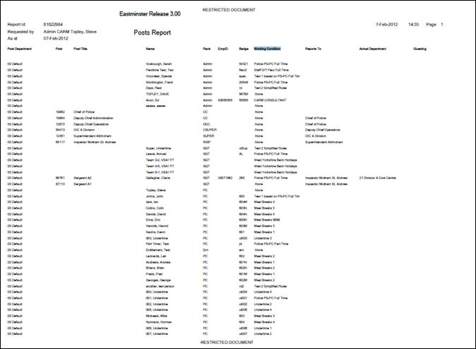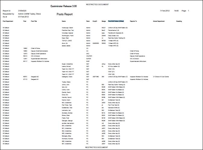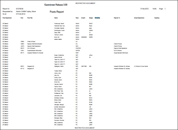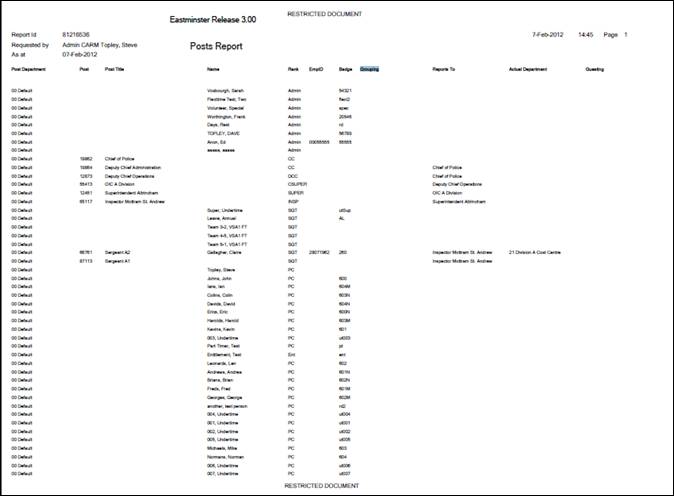 Report listing all posts by division/department and who, if anybody is in those posts: and which position do they report to. The only parameter is an 'effective' date.