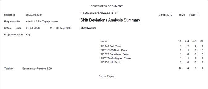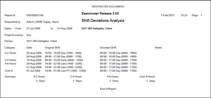 Report analyses all the occasions when changes were made to the start time of shifts (shifts were deviated from their normal start time) within a selected date range. Shift deviations are categorised as being in one of the following: