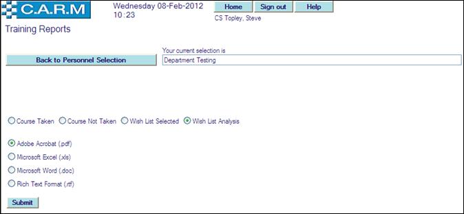 · Select type of Training report required and the report format (See Choosing your output and display)