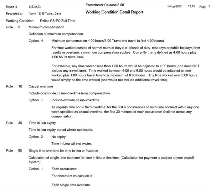 Report prints all the rules and options for a selected working condition (or all rules and options available).
