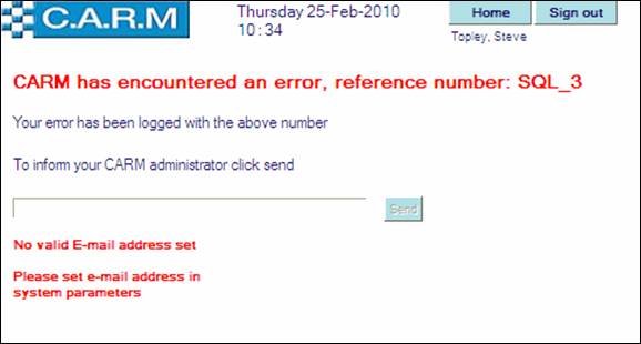 When a system error occurs the following error message is shown with a reference number and if a valid E-mail address is shown, then by clicking the send button a notification E-mail message will be sent to the CARM administrators for rectification.