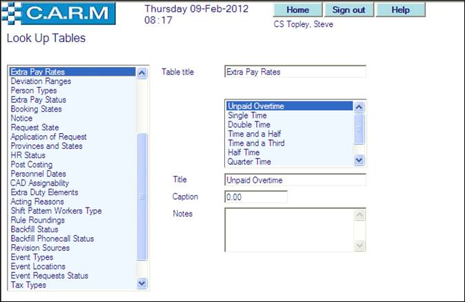 Some lookup options are for historical purposes i.e. to maintain entries from previous versions of CARM and will be phased out during future issues. There are some lookup tables that must not be changed by the user as CARM is dependent upon the values in them. These are suppressed such that the user cannot change them. |