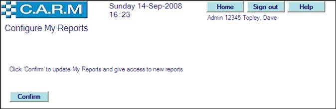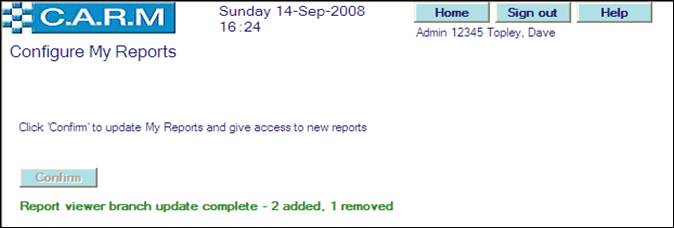 A confirmation message detailing the number of 'branches' (folders under the MyReports folder) added and removed from the CARM menu will be displayed.